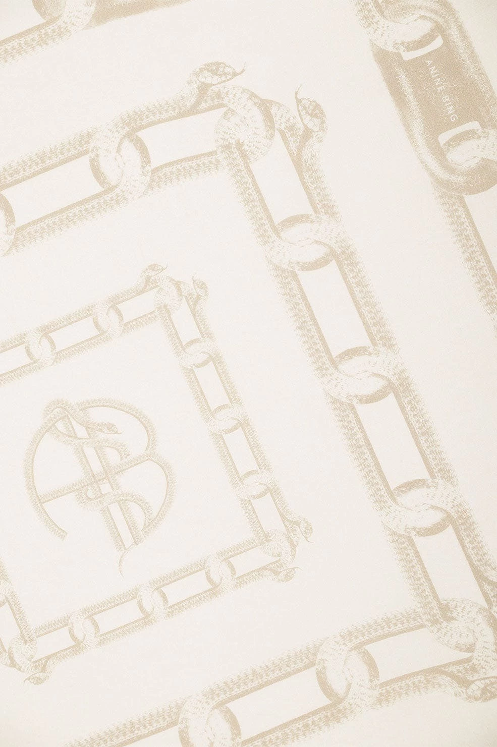 A square neck scarf crafted from 100% silk twill featuring a subtle snake formation hidden within a cream and tan link print.