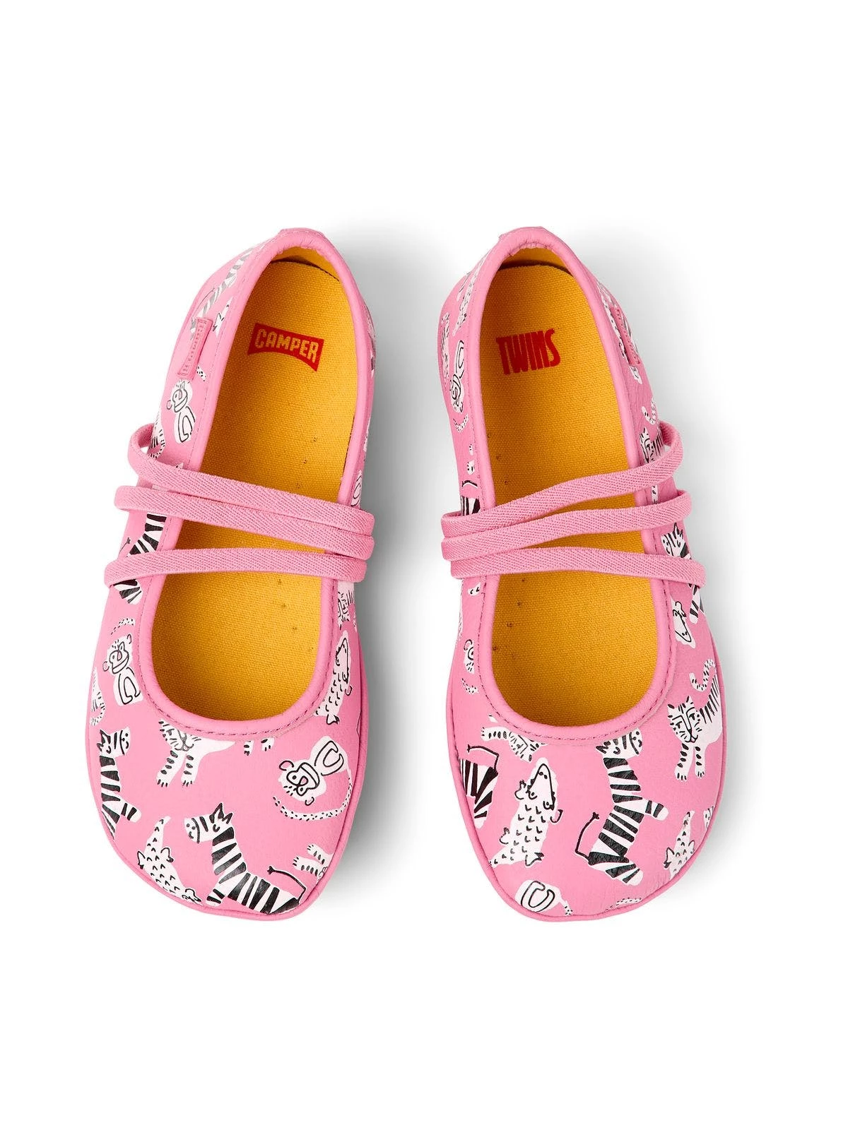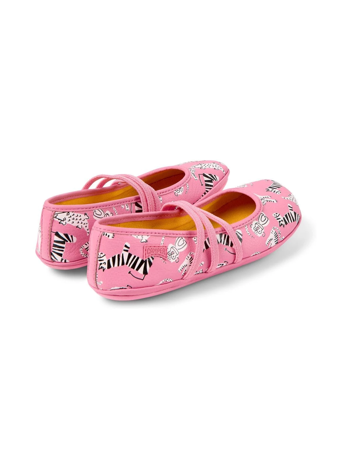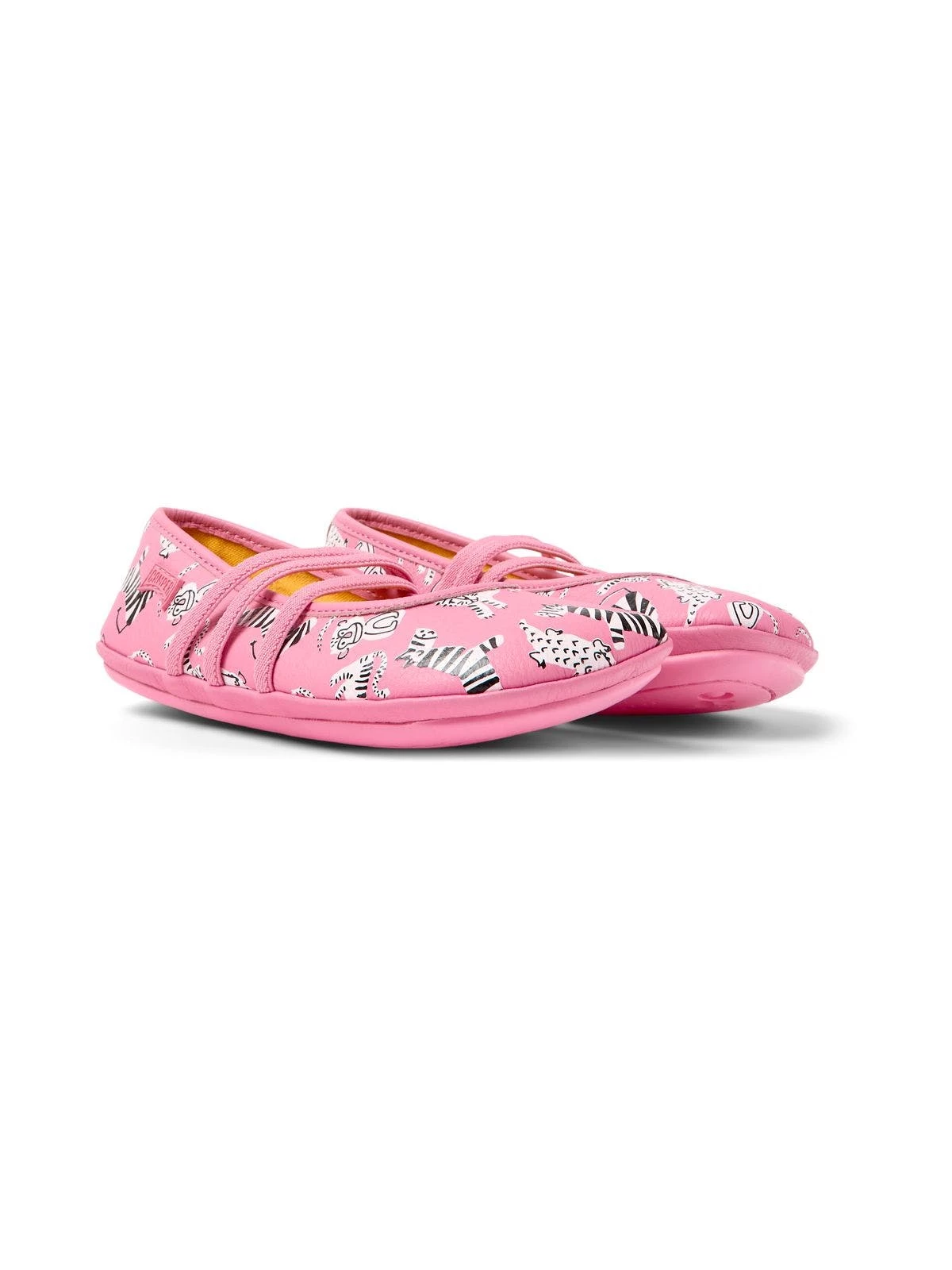 Pink leather kids’ ballerinas with animal print motif, removable EVA footbeds and rubber outsoles (20% recycled). Born in 1988, Classic twins concept opposite yet complementary challenges the idea that shoes must be identical and lives on in these mismatched kids shoes to form a truly unique pair.