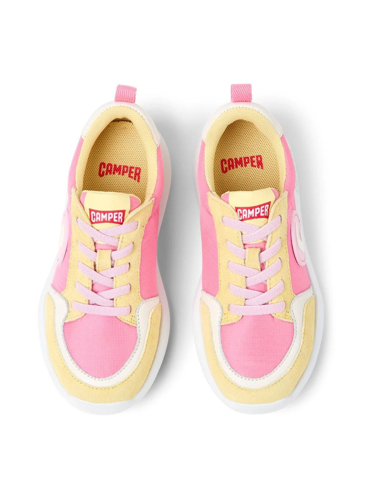 Pink and yellow textile and nubuck kids’ sneakers with 75% recycled PET elastic laces and EVA outsoles. The lightweight Driftie is Camper’s distinctive urban sporty style with breathable cushioning.