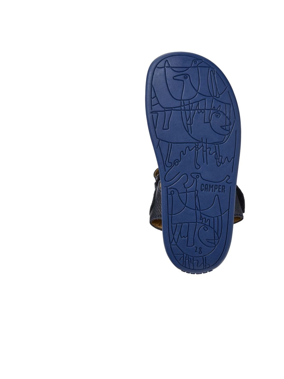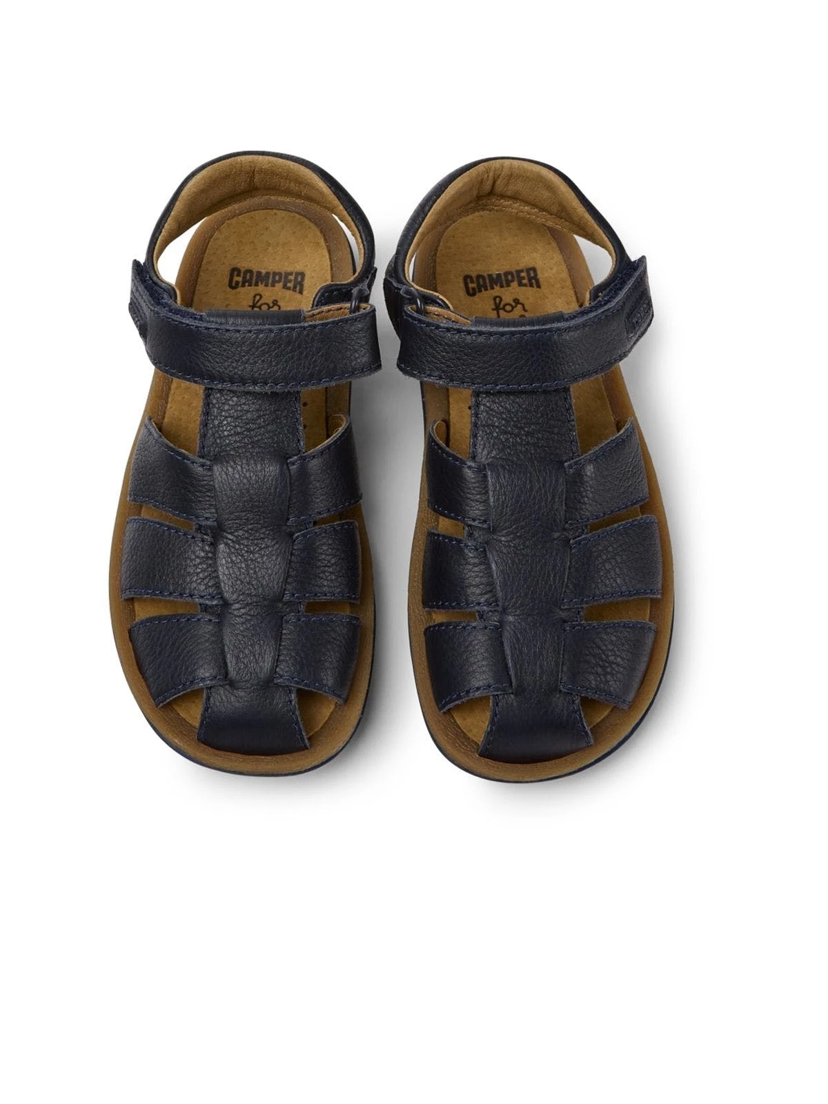 Dark blue leather kids’ sandals with hook-and-loop closing system and 100% rubber outsoles (20% recycled). Bicho offers a playful twist on the classic sandal, fusing better materials with pops of color, ergonomic design, and easy-fit fastenings.