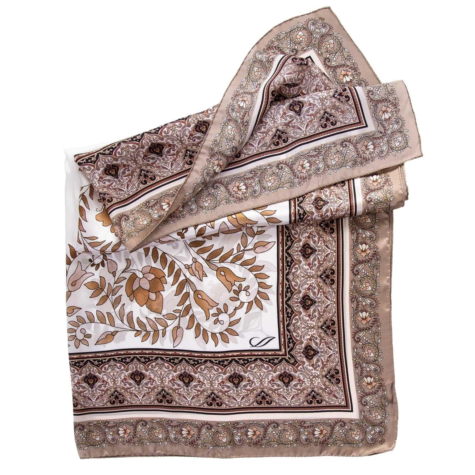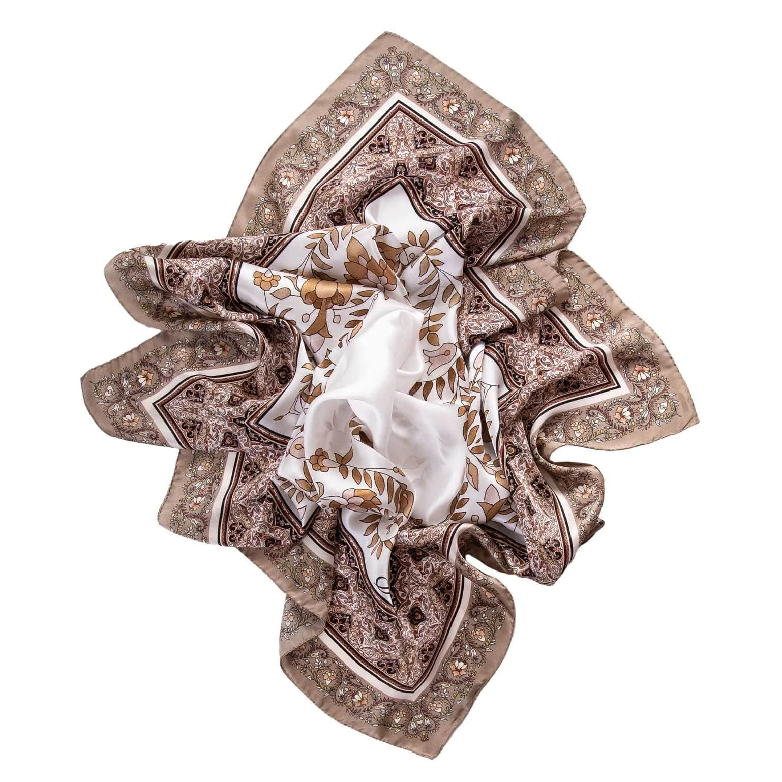 Classic neutrals grace this silk satin foulard. An intricate floral print in colors to wear with everything.