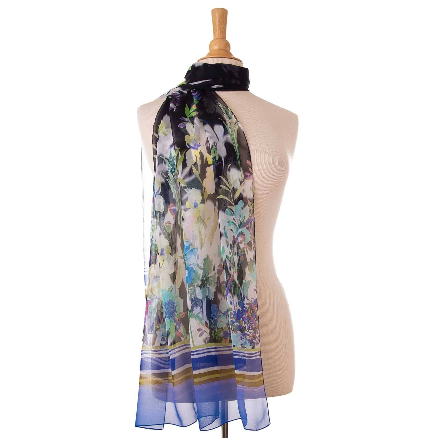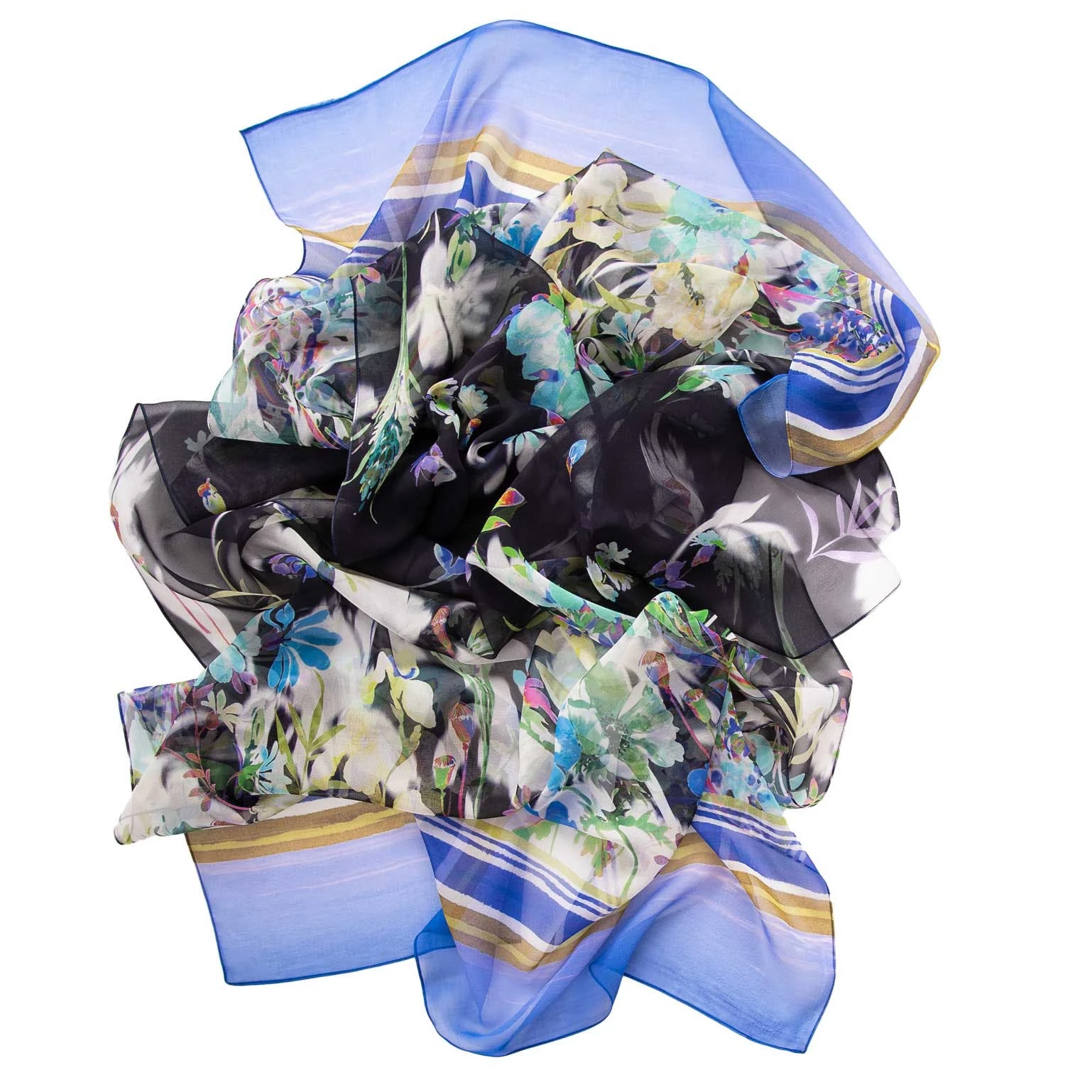 This delicate, sheer silk georgette scarf boasts a lovely floral print in blues on navy. Perfect for transitioning from day to evening. Large size can be worn as a scarf or a shawl.