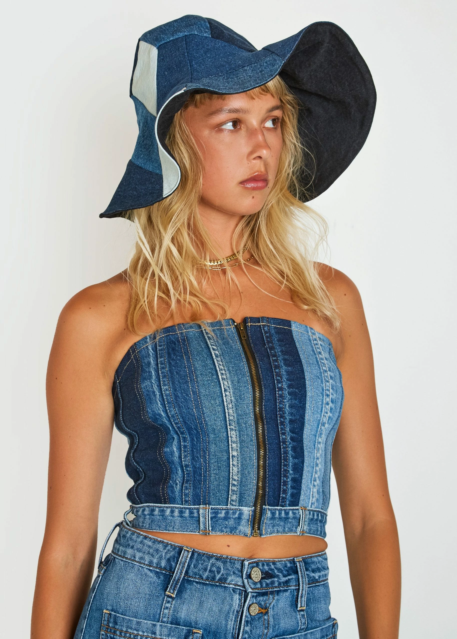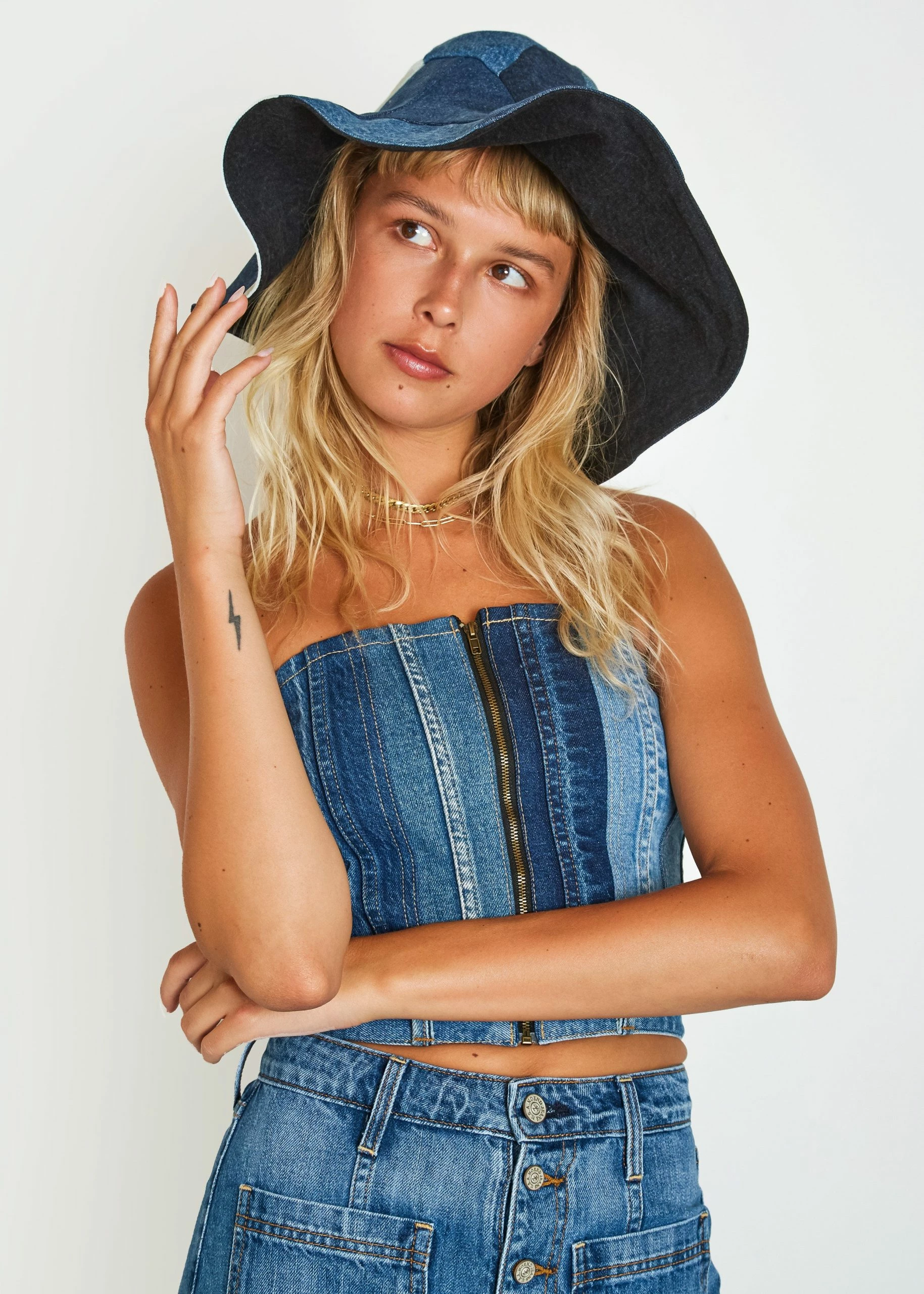 Women’s summer classic. Update a summer classic in the JENNY, this up-cycled denim Floppy Hat and pair it with some loose summer shorts and sandals.